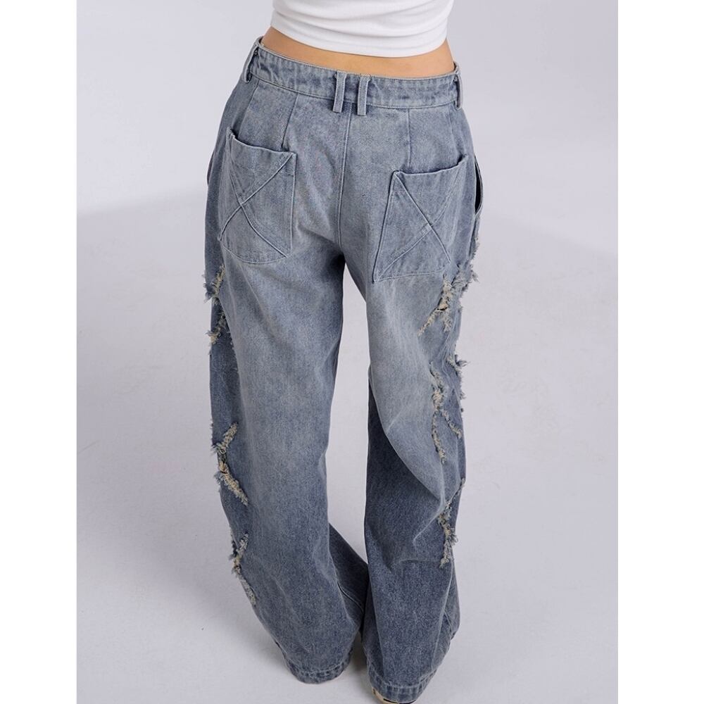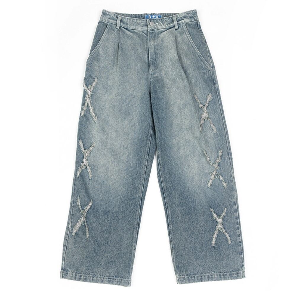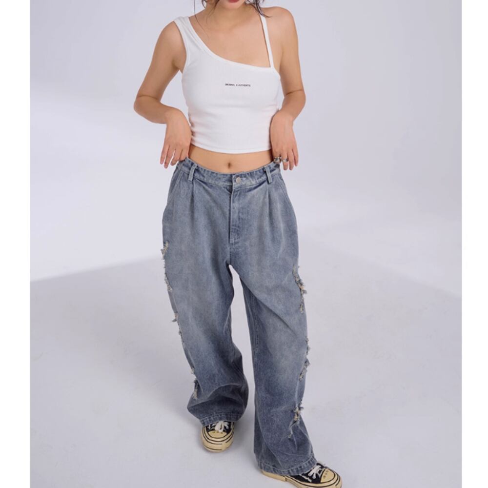 洗練されたウォッシュドカラーが魅力のワイドレッグストレートデニムジーンズ。