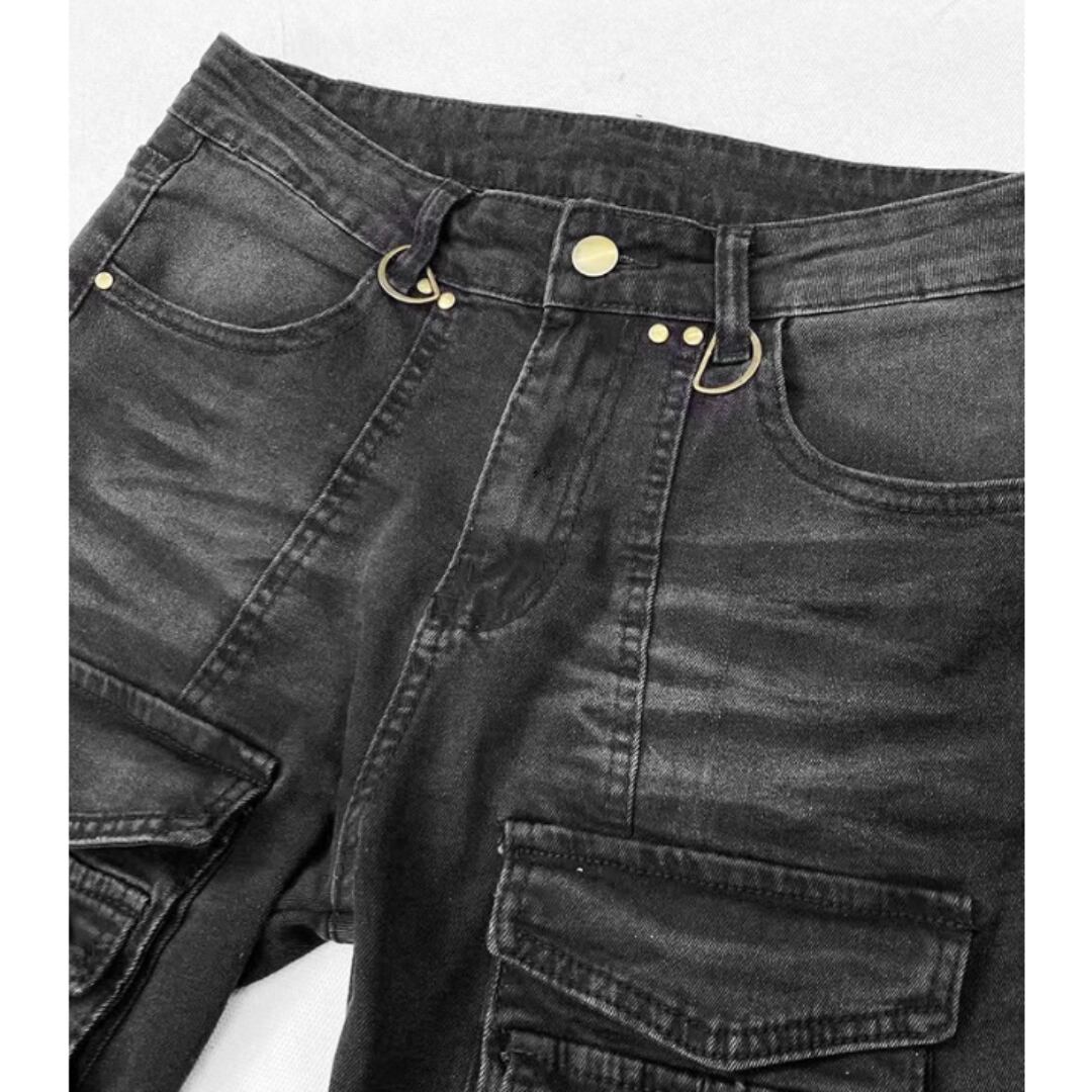 マルチポケットがアクセントのフレアデニムパンツ。