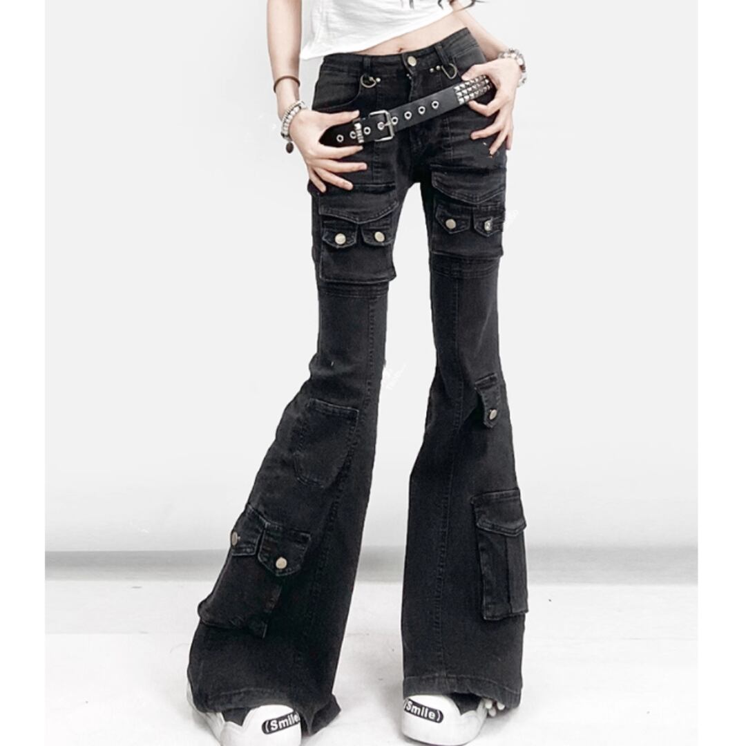 Multi-pocket flare denim pants E7048