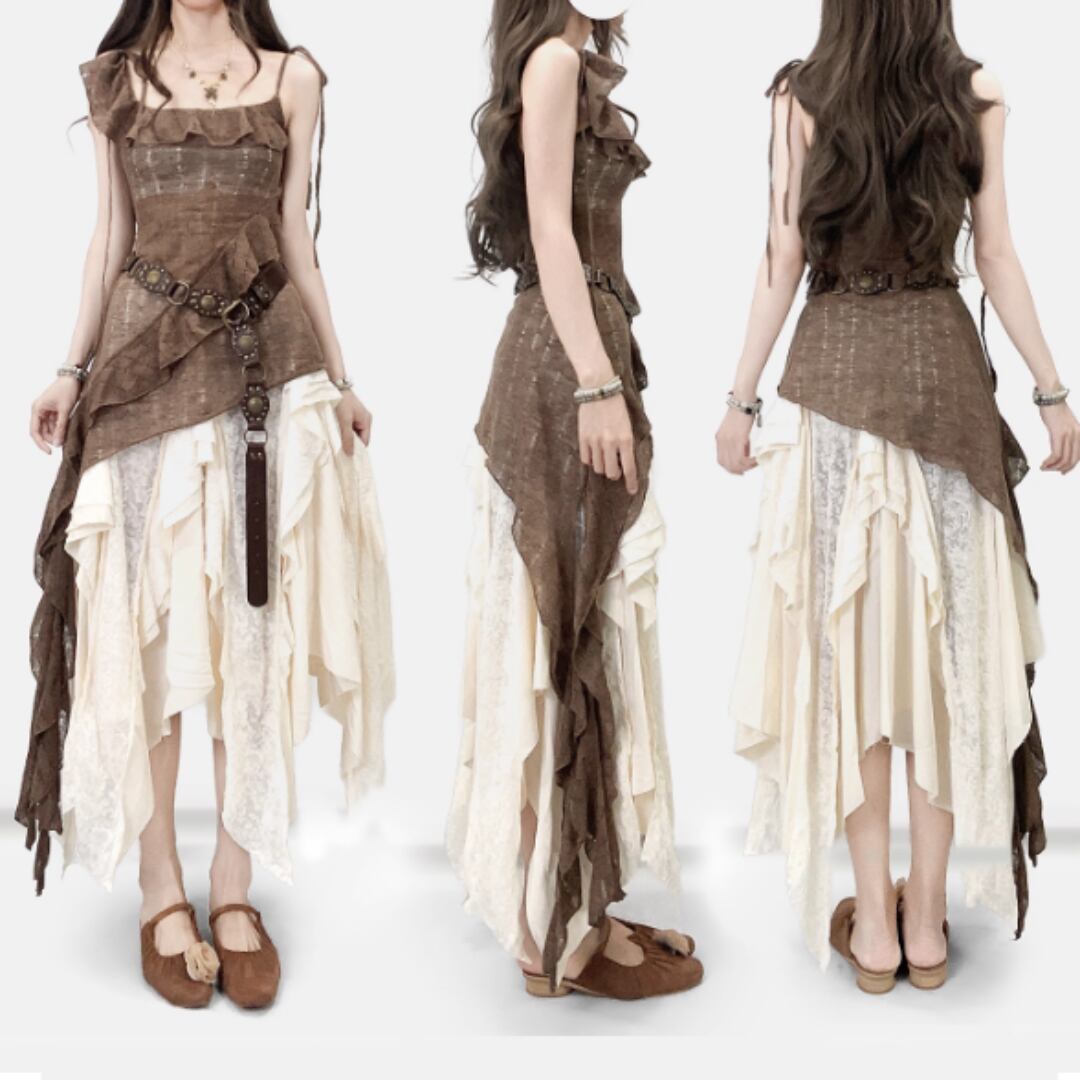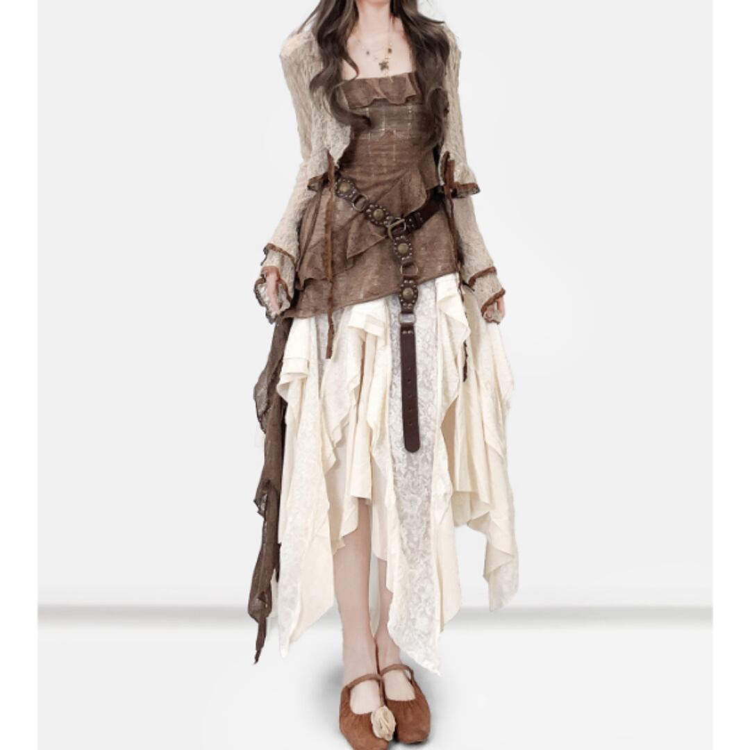 ワンピース、カーディガン、スカートの3ピースのセットアップ。
