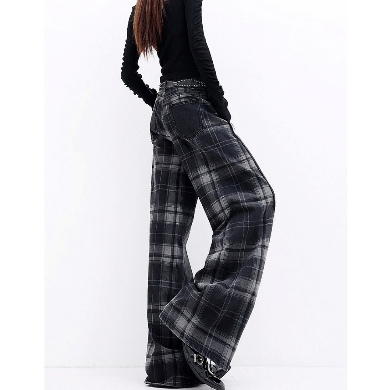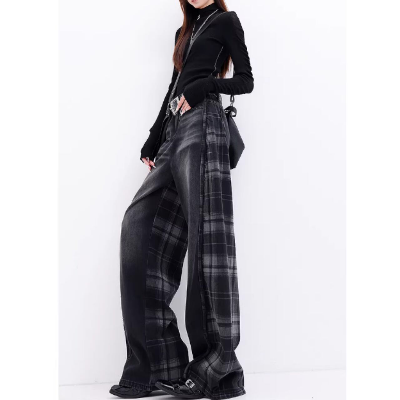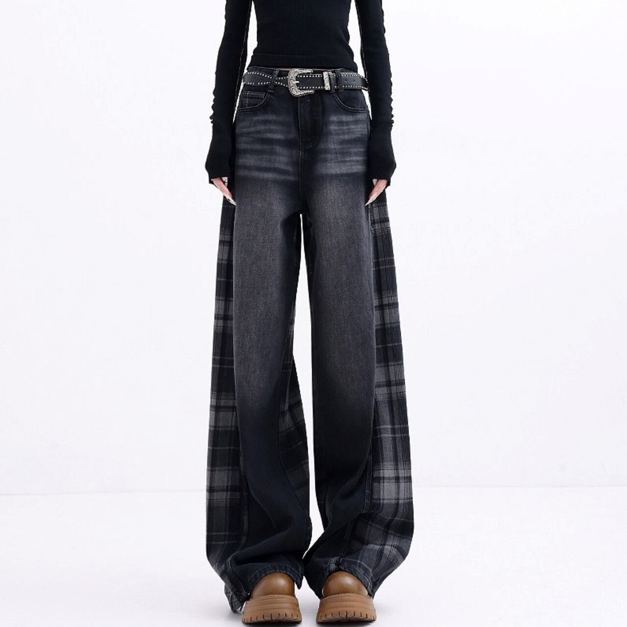 チェック柄がアクセントのワイドデニムジーンズ。