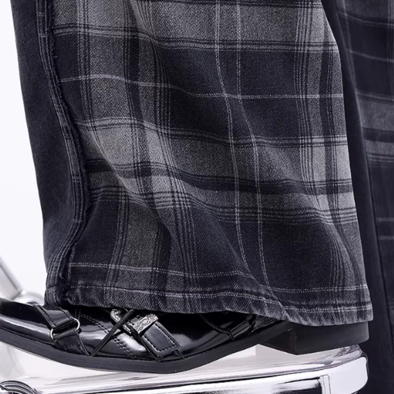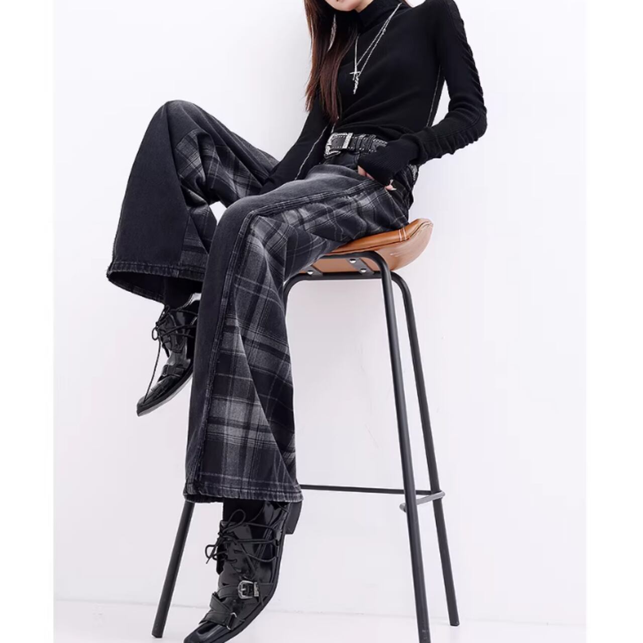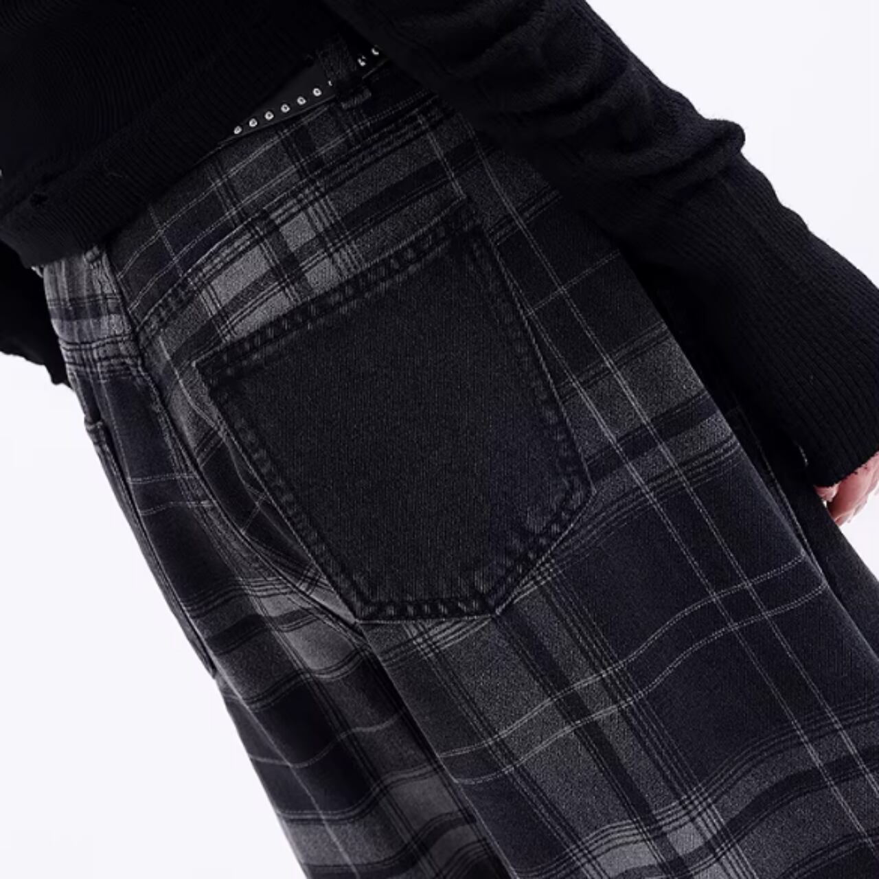 チェック柄がアクセントのワイドデニムジーンズ。