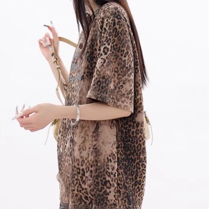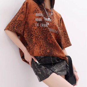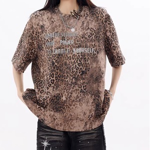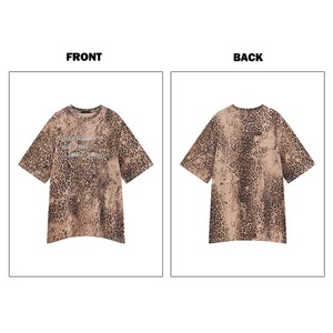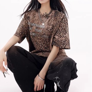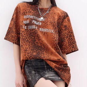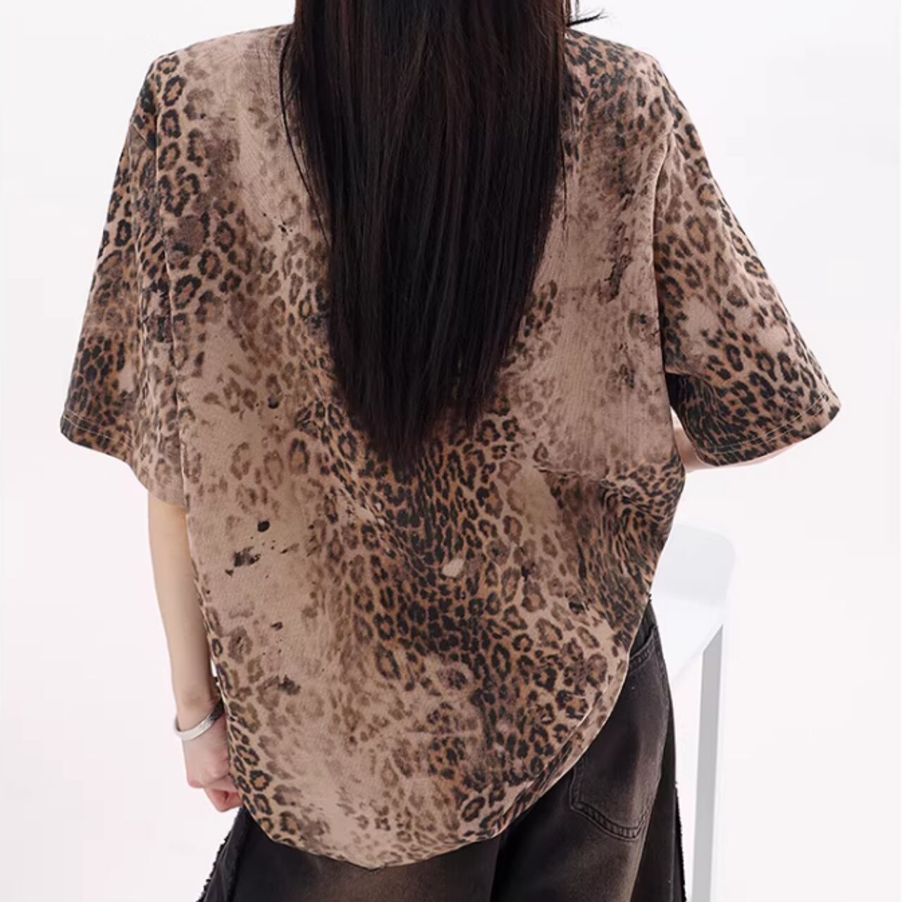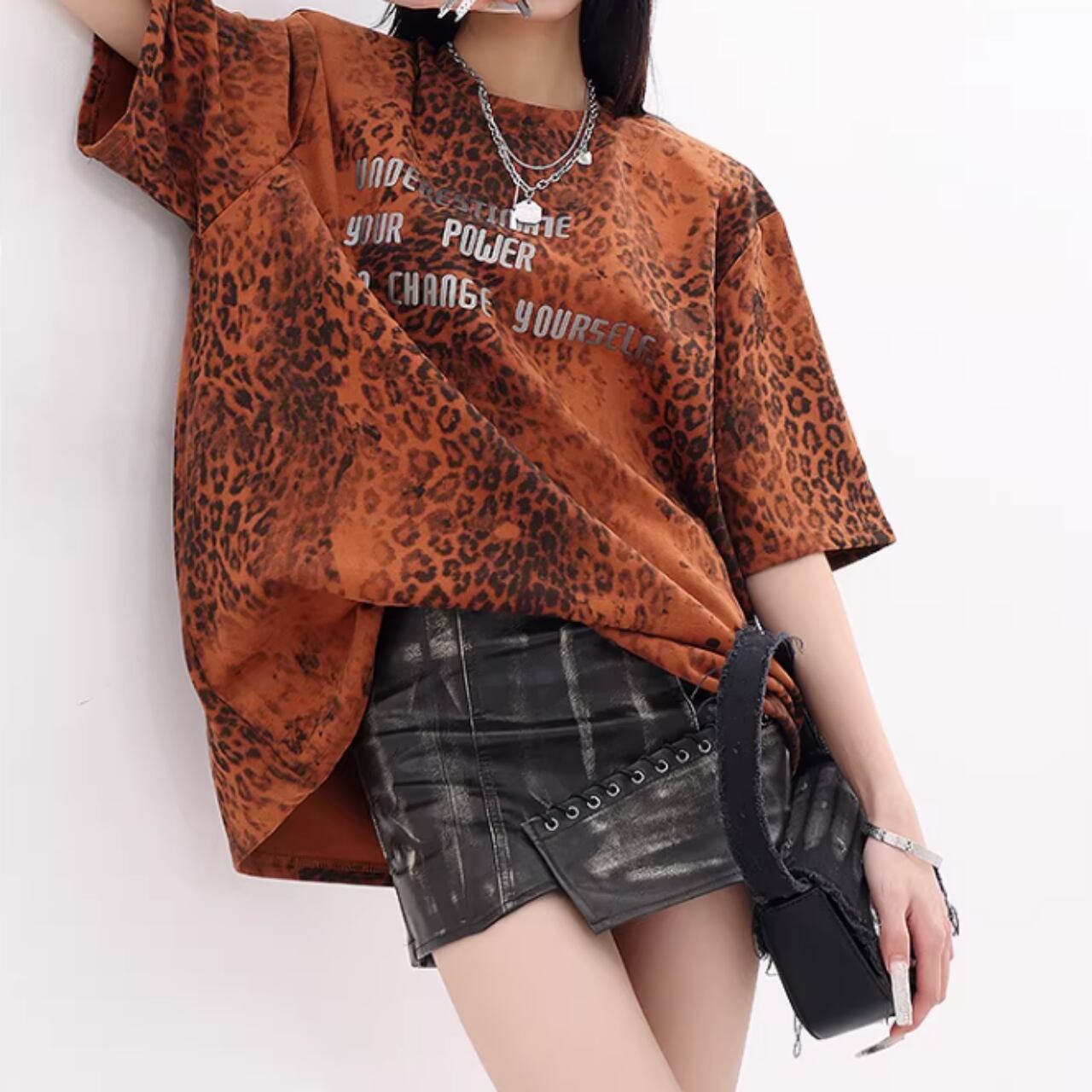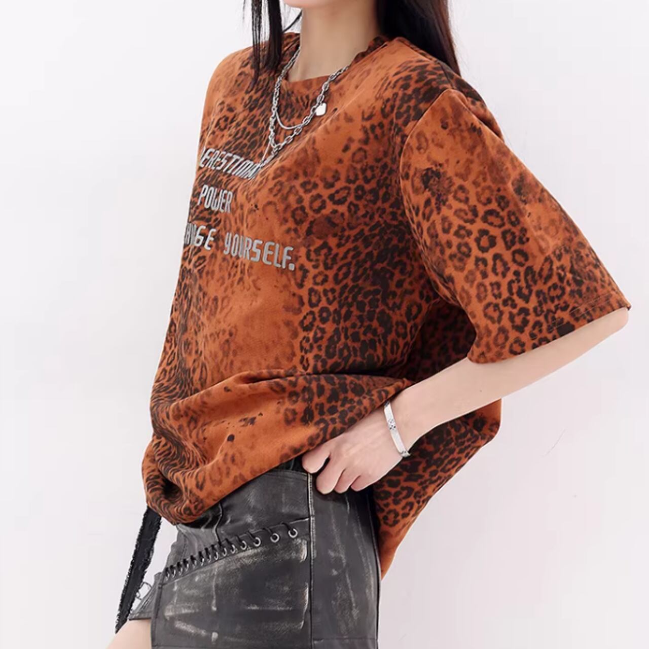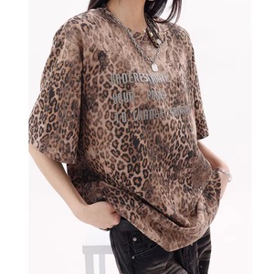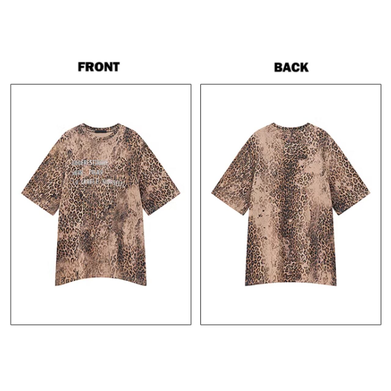 大胆なレオパード柄とスタイリッシュなレタープリントが魅力のオーバーサイズTシャツ。