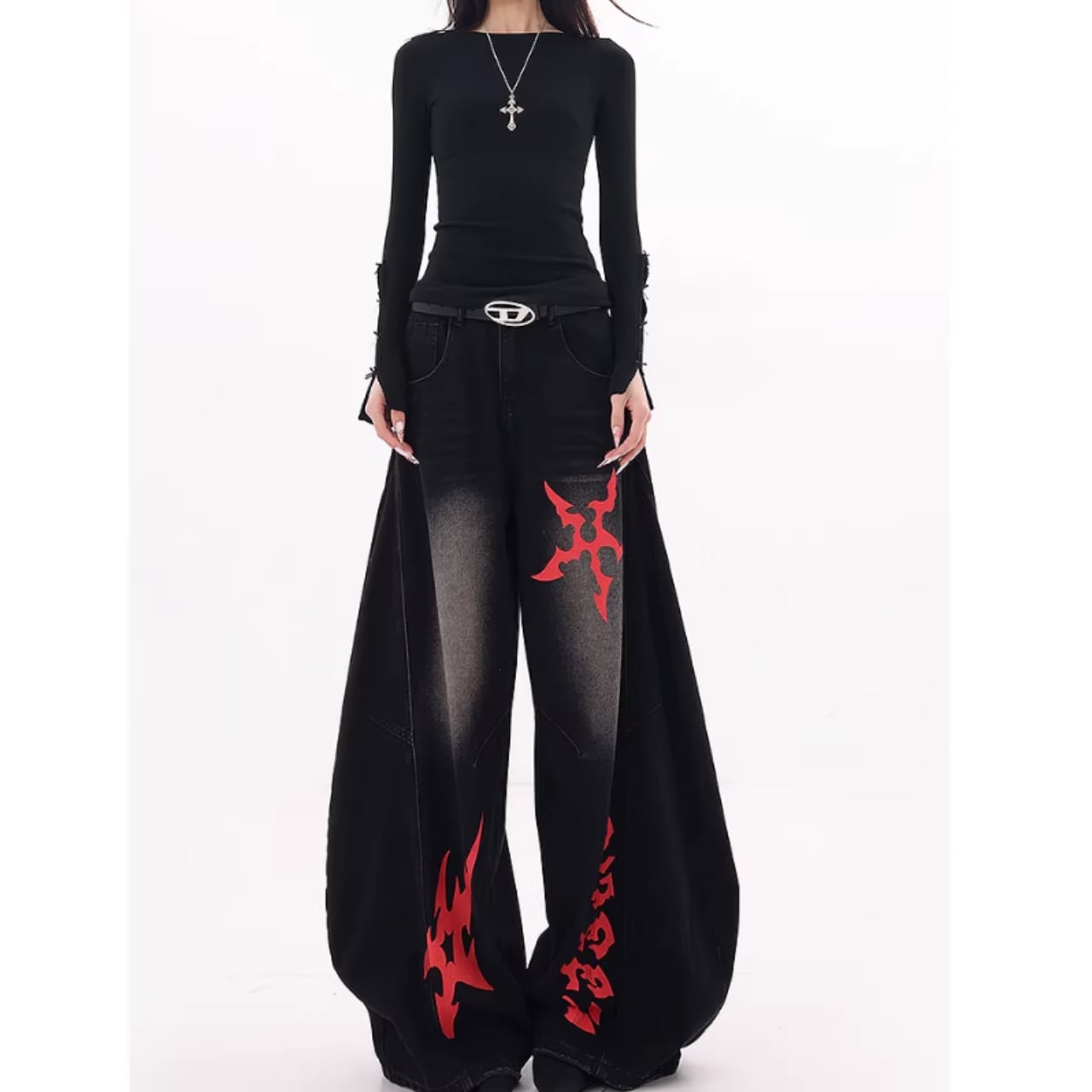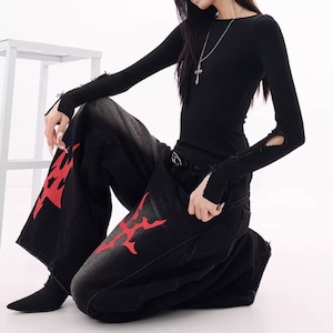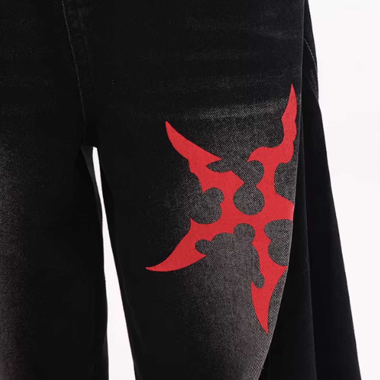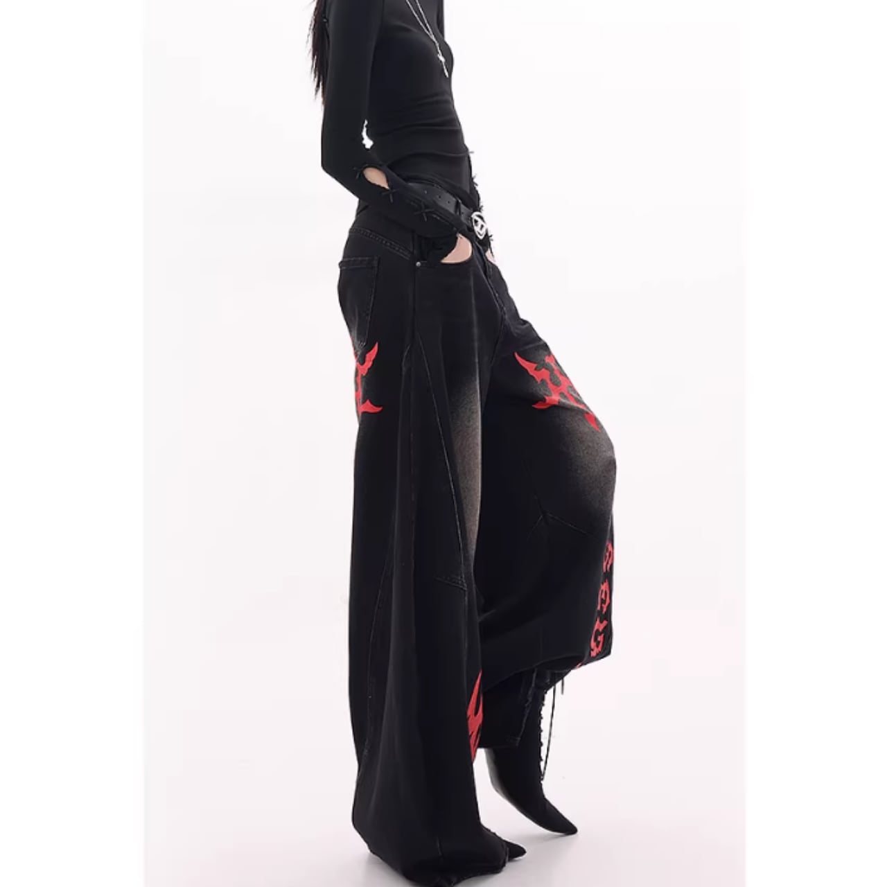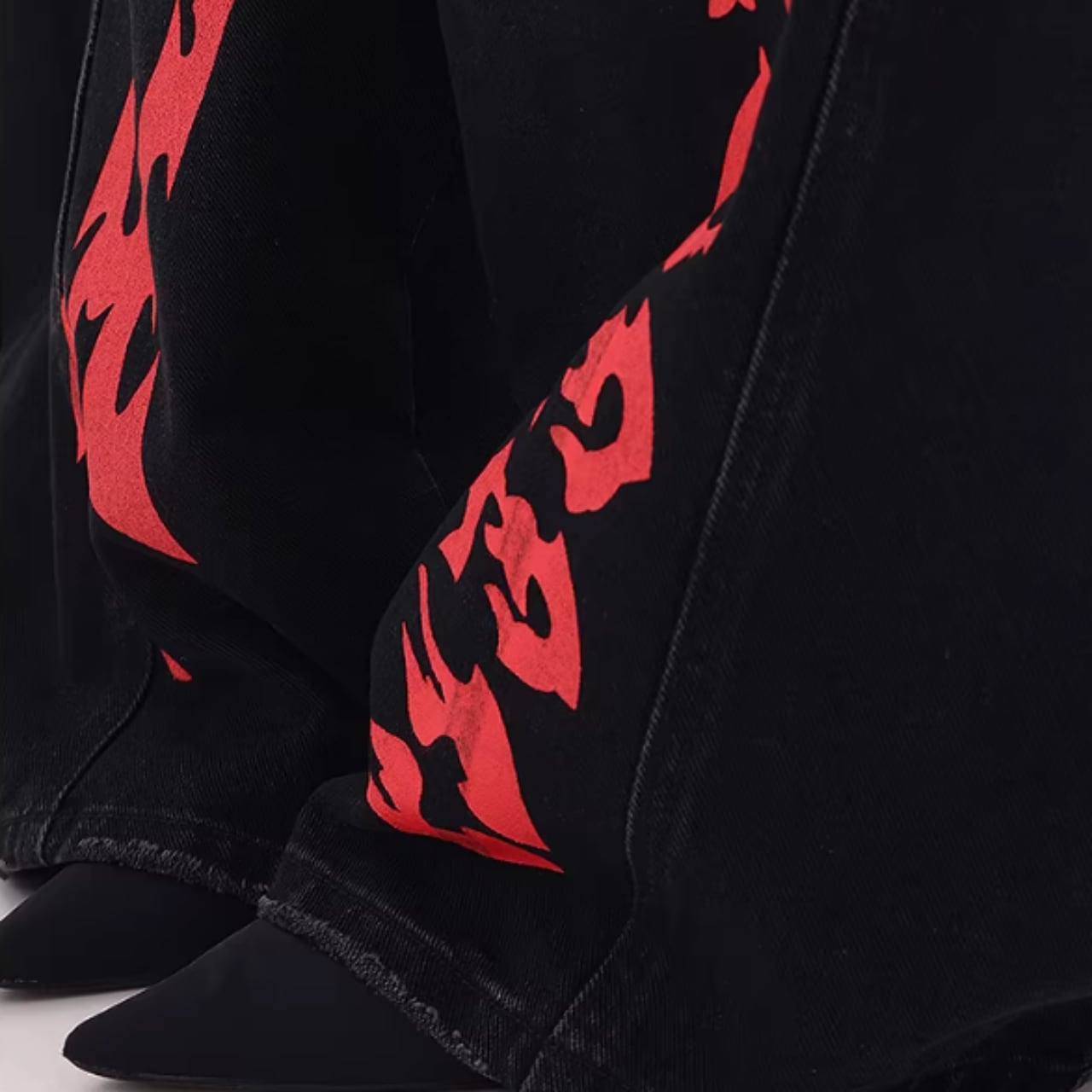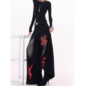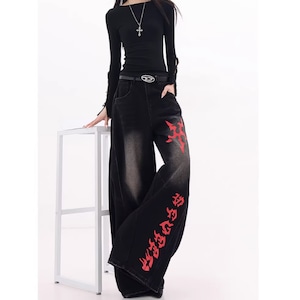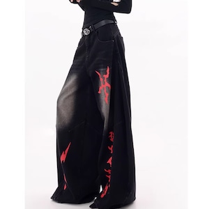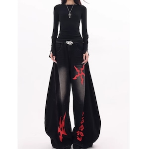 印象的なプリントが目を引くワイドレッグカーブデニムジャンス。
