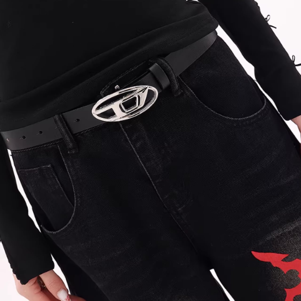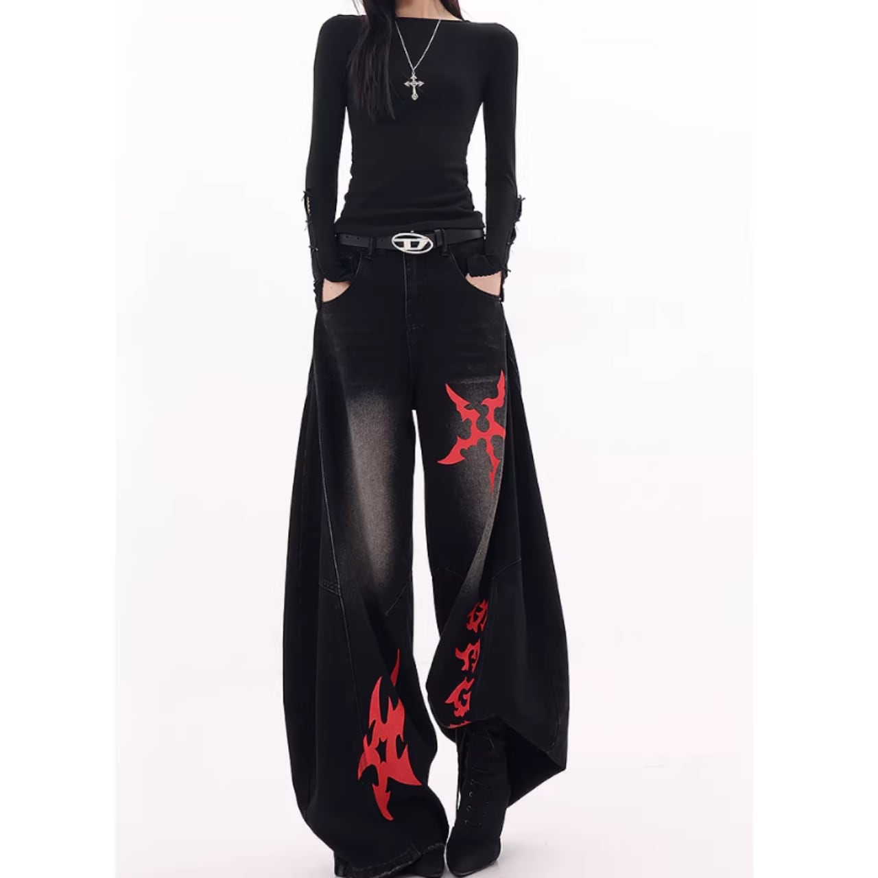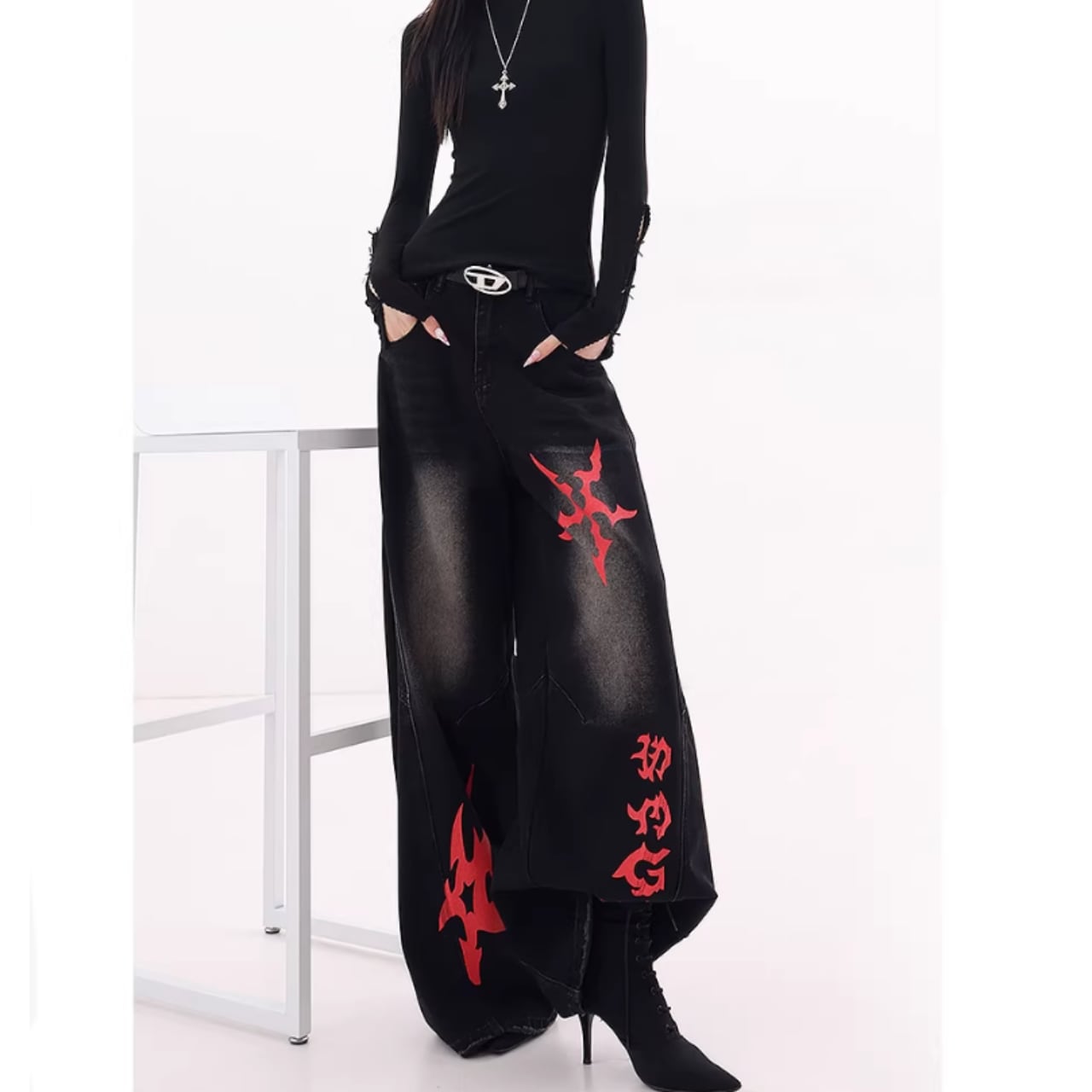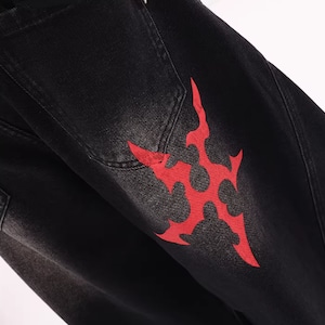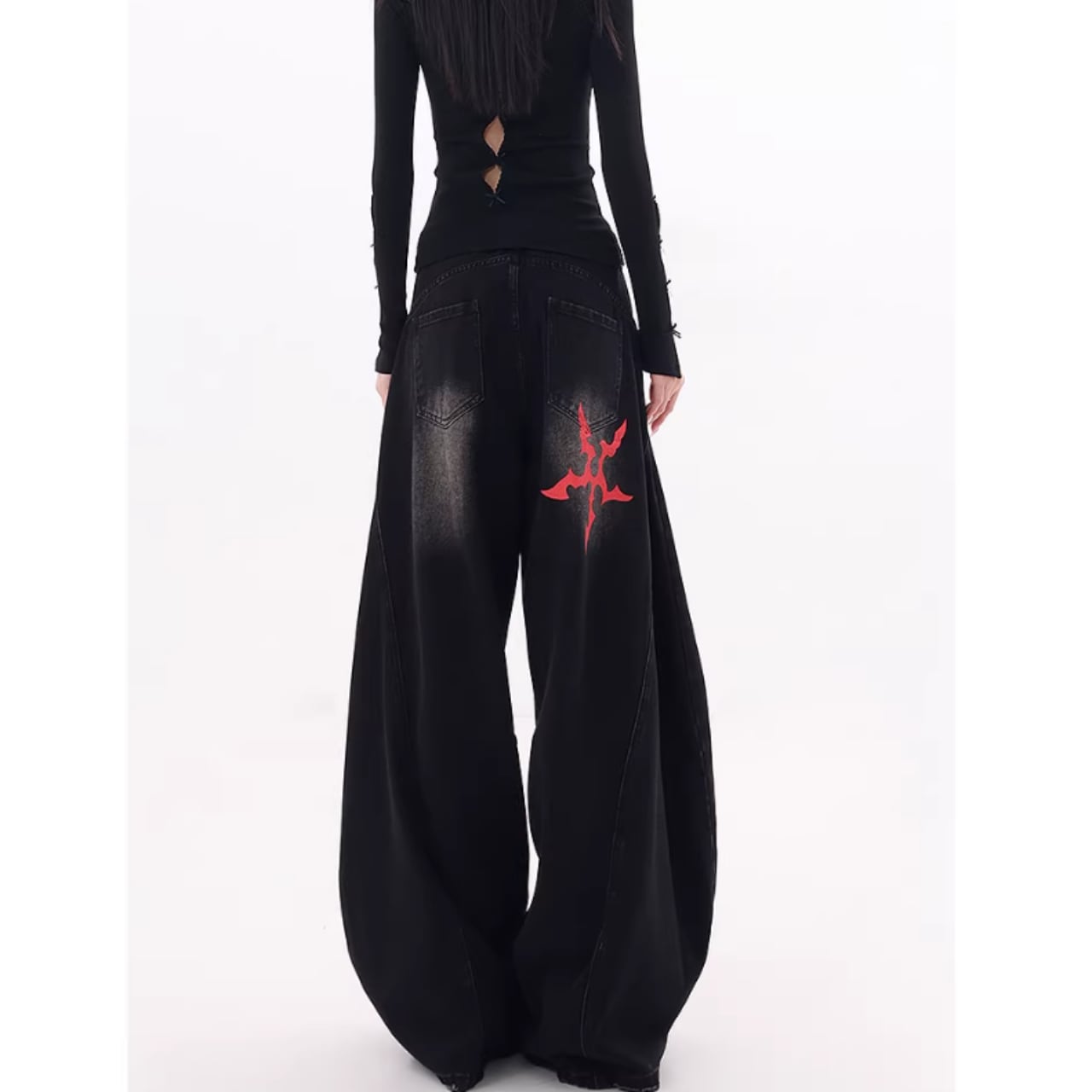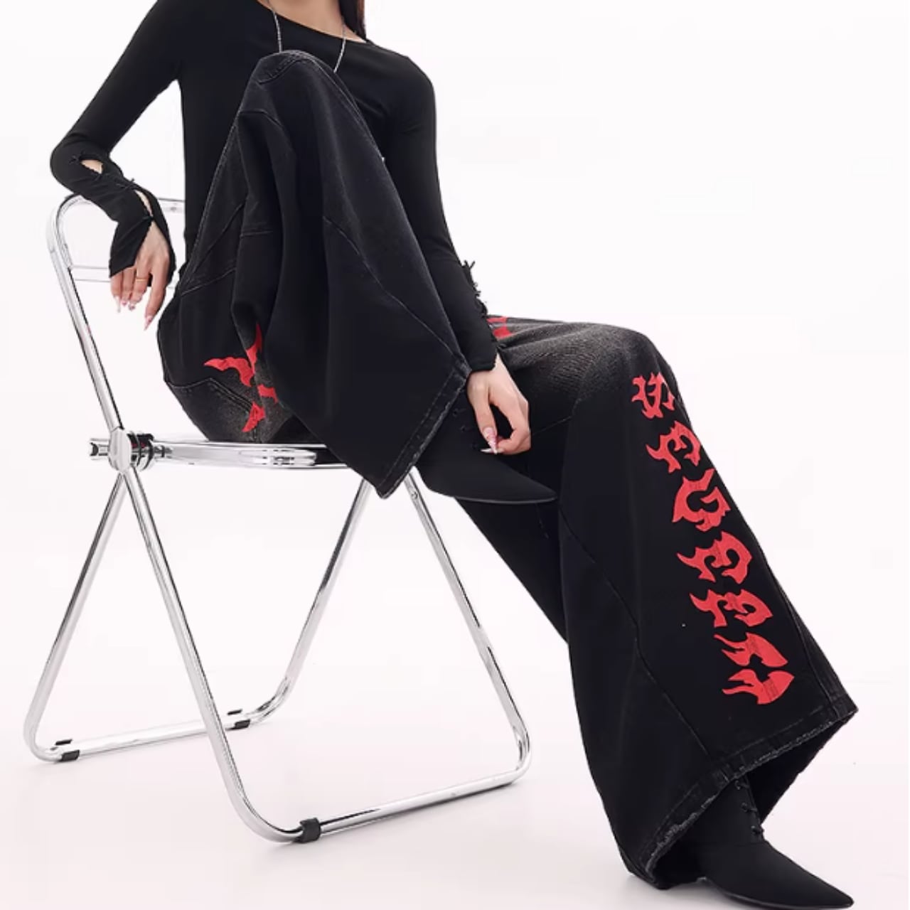 印象的なプリントが目を引くワイドレッグカーブデニムジャンス。