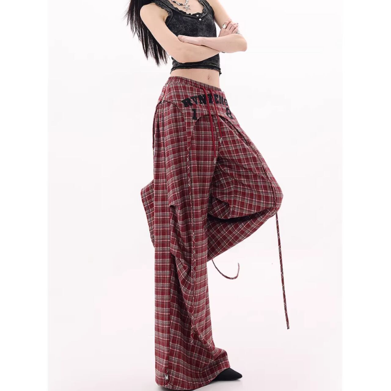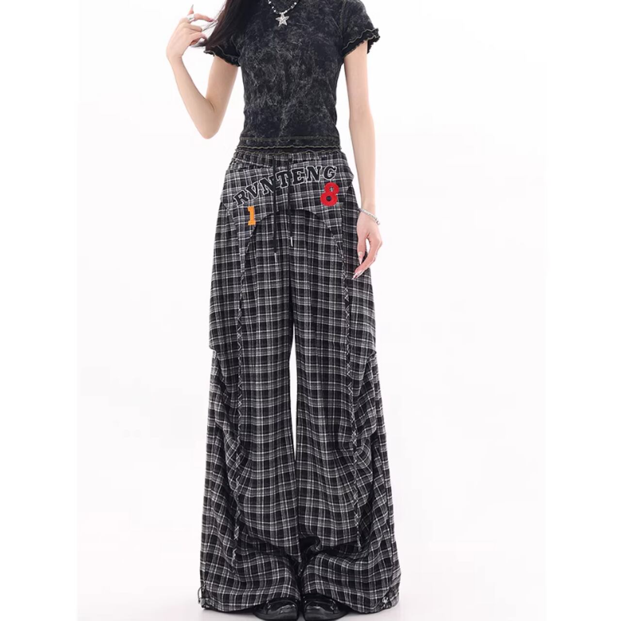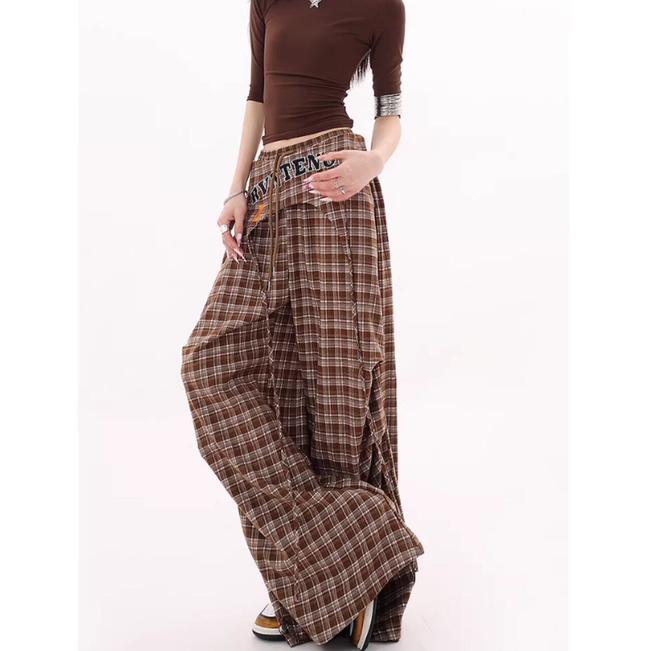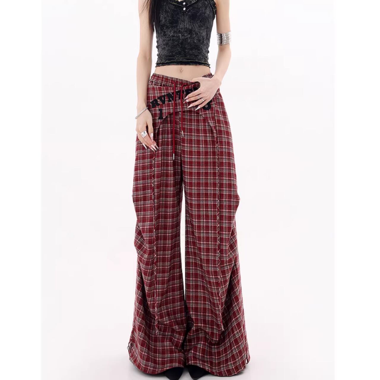 カジュアルなチェック柄が目を引くチェック柄ワイドパンツ。