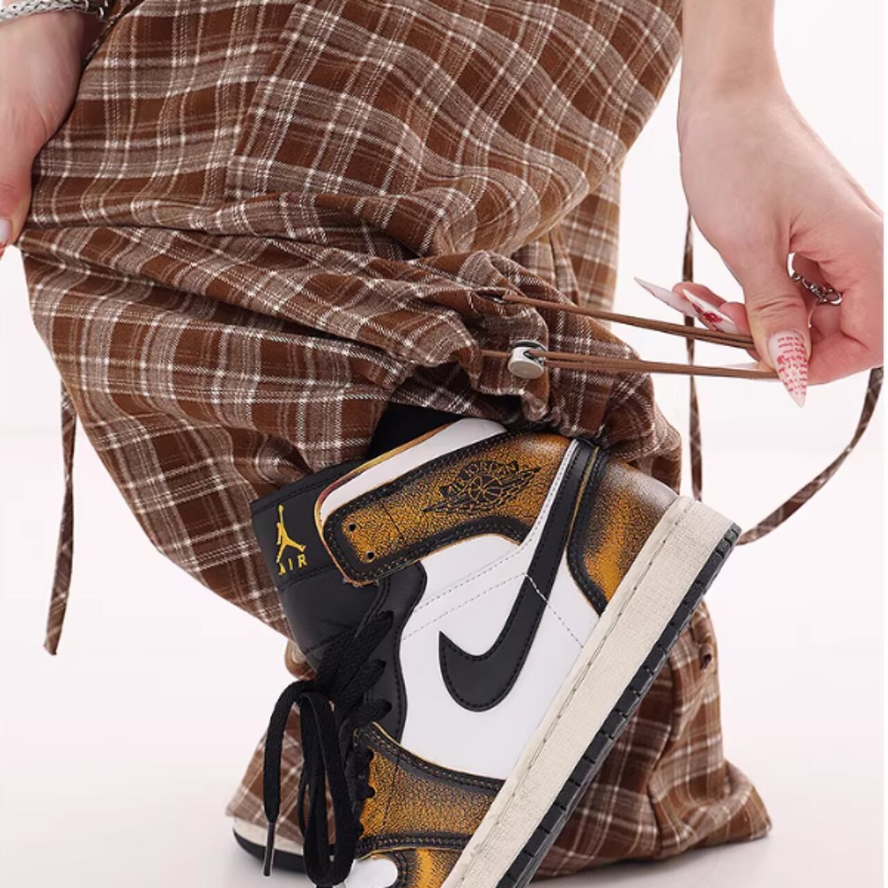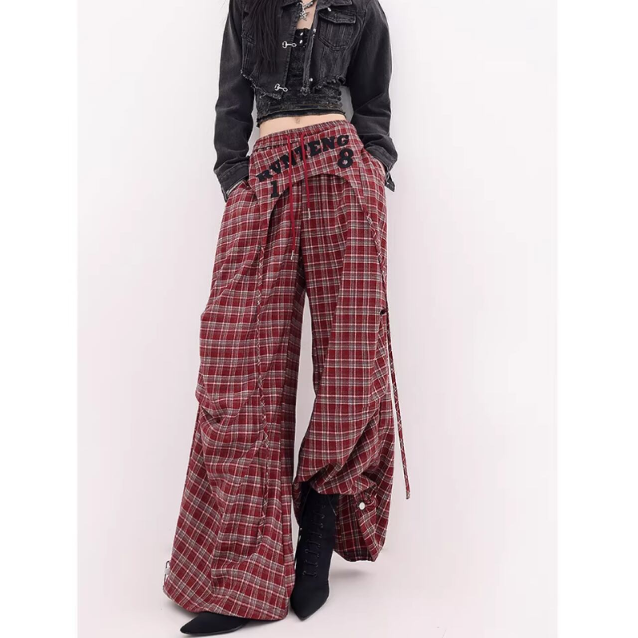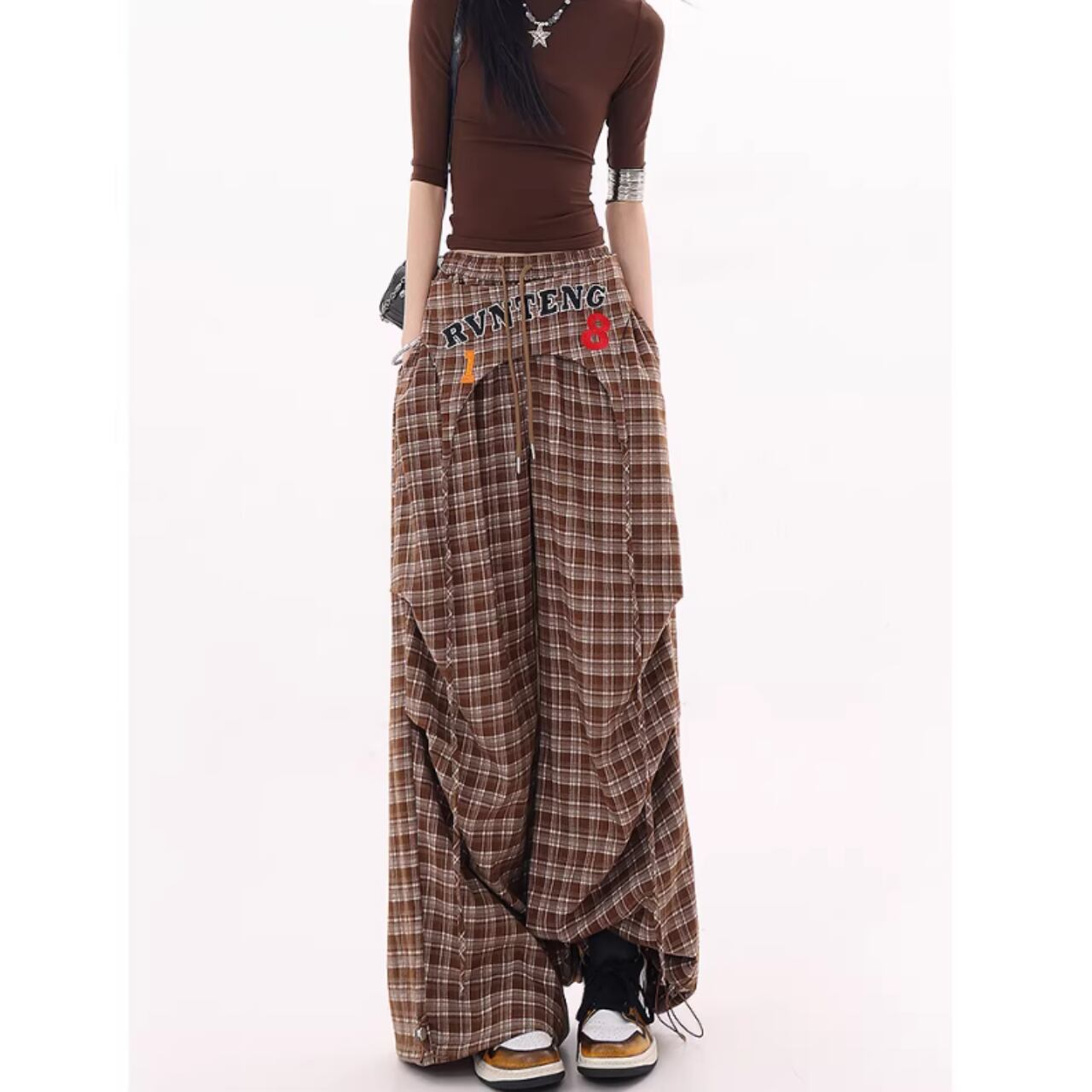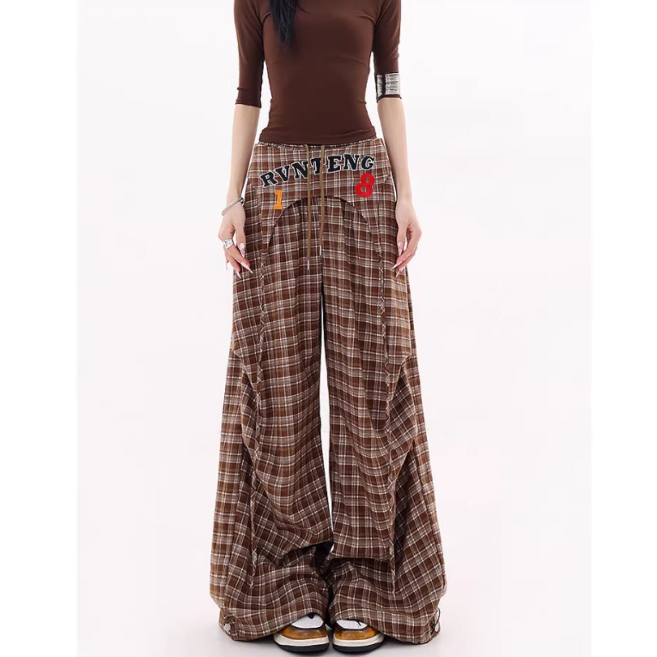 カジュアルなチェック柄が目を引くチェック柄ワイドパンツ。