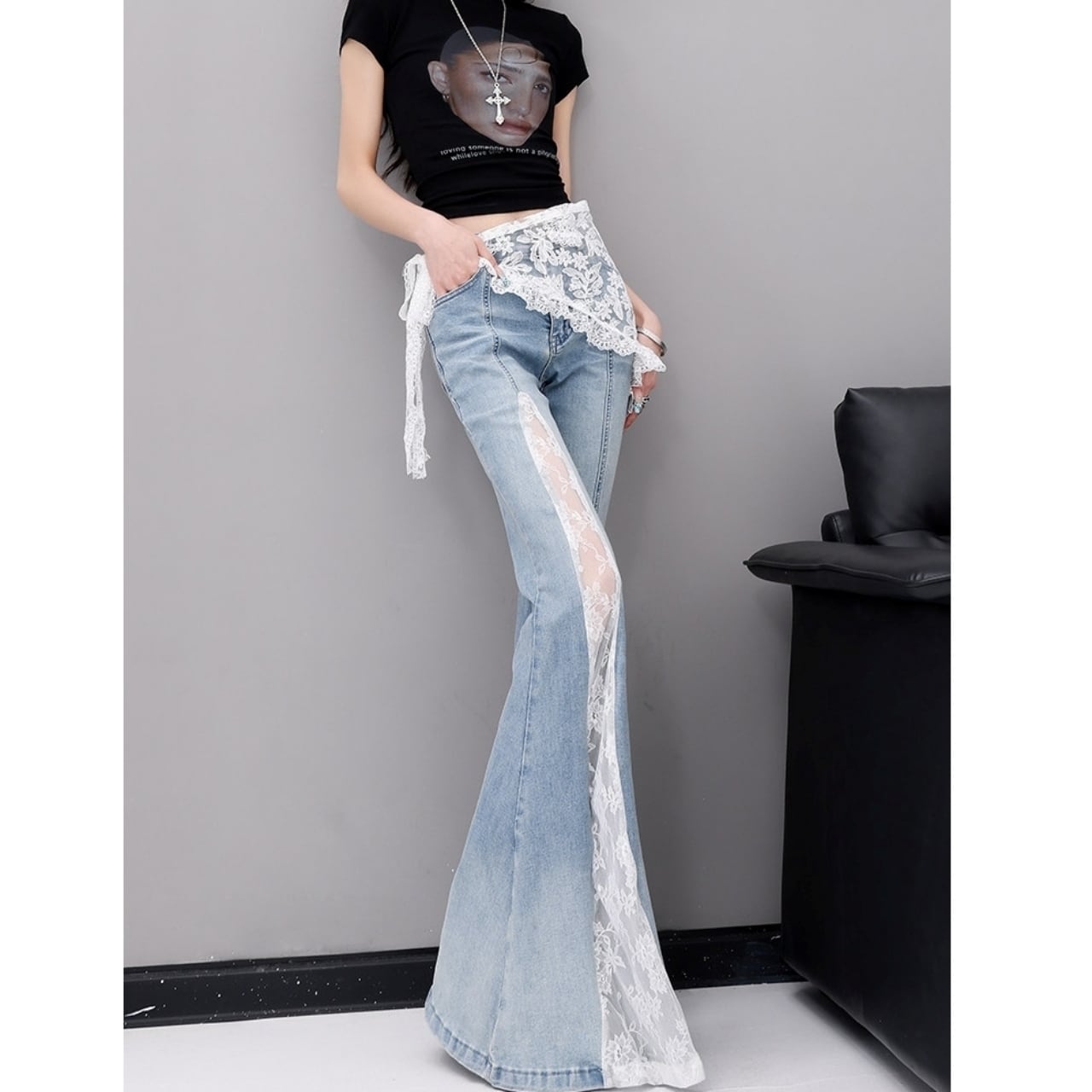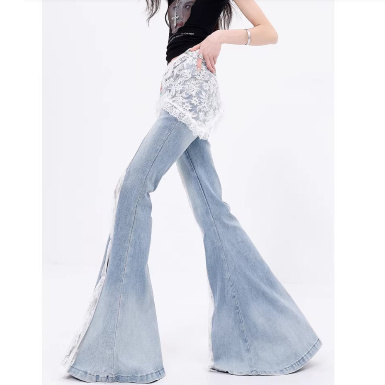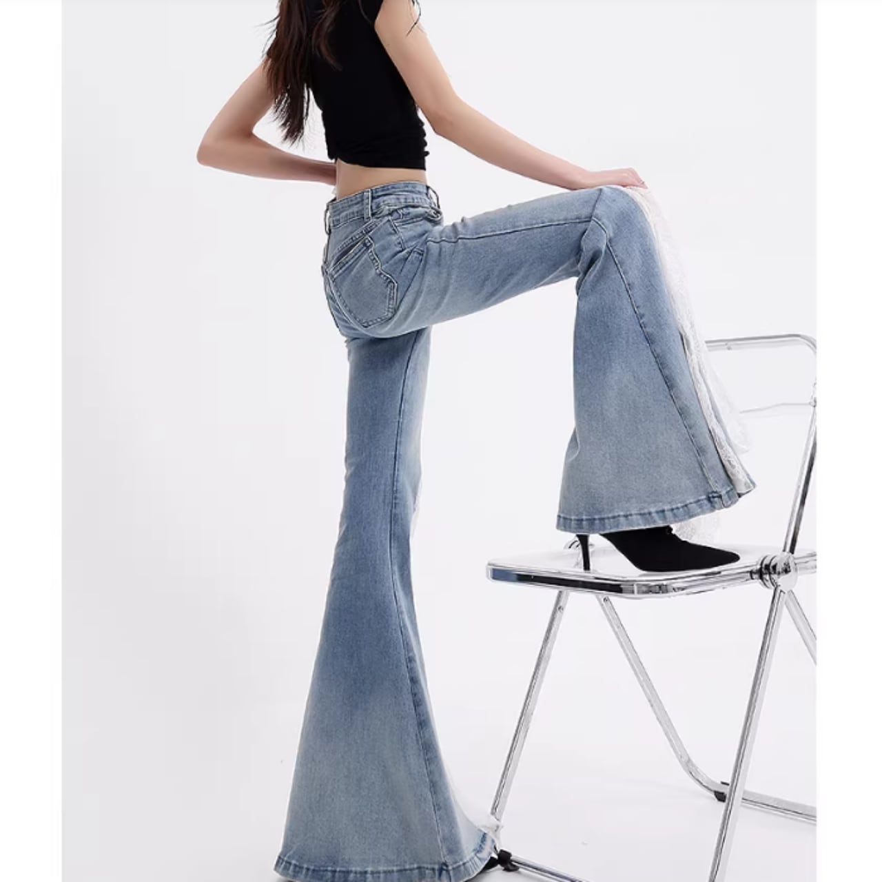 脚長効果抜群のレースフレアジーンズ。