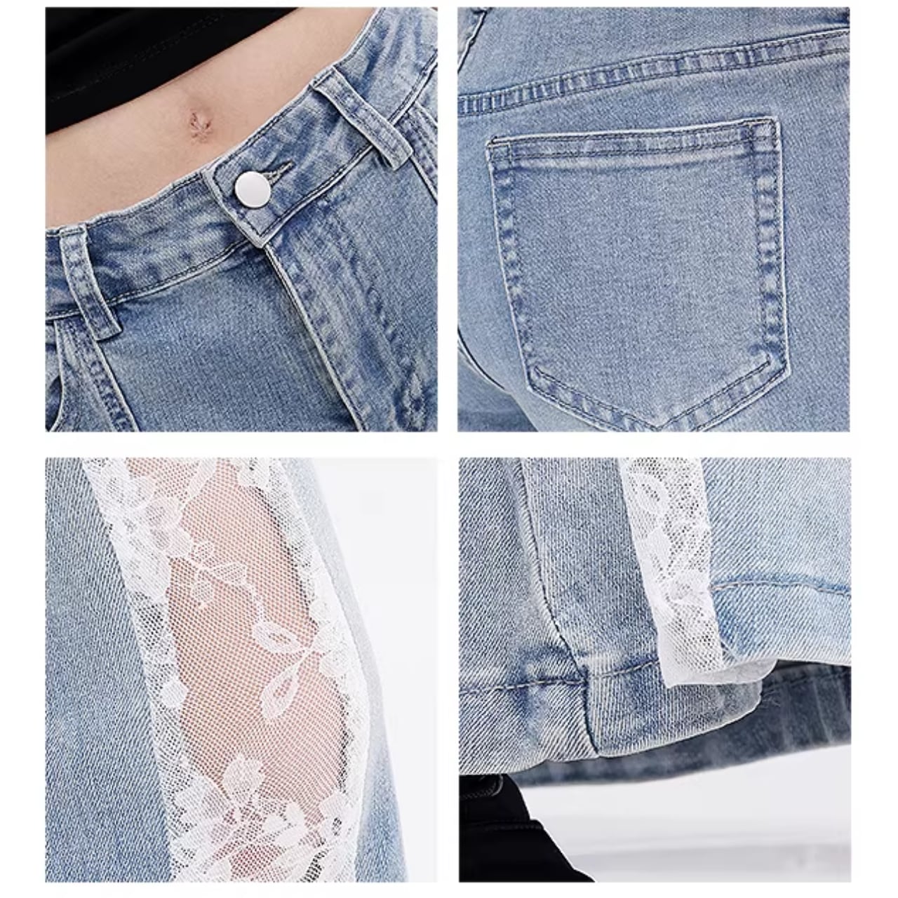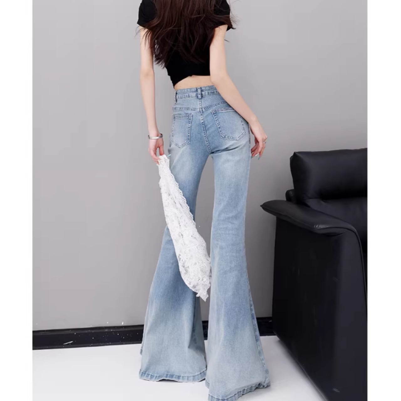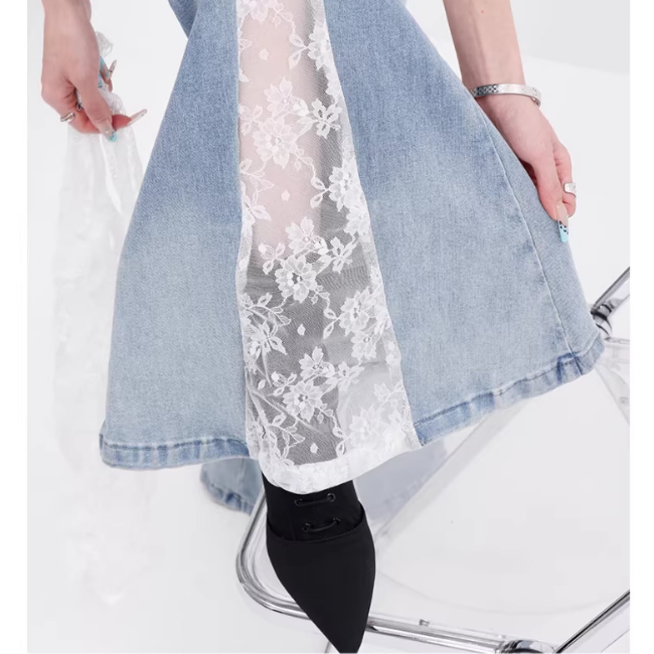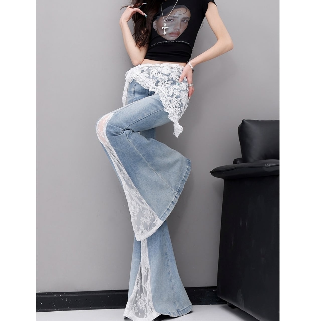 脚長効果抜群のレースフレアジーンズ。
