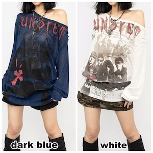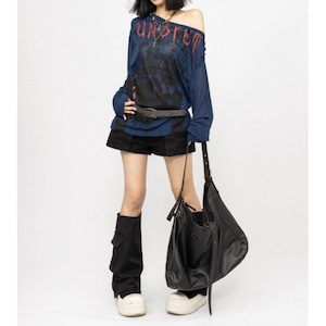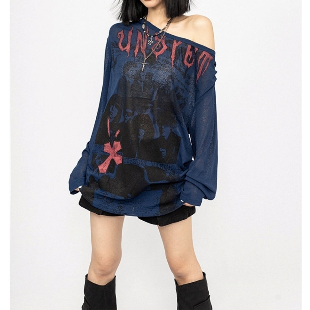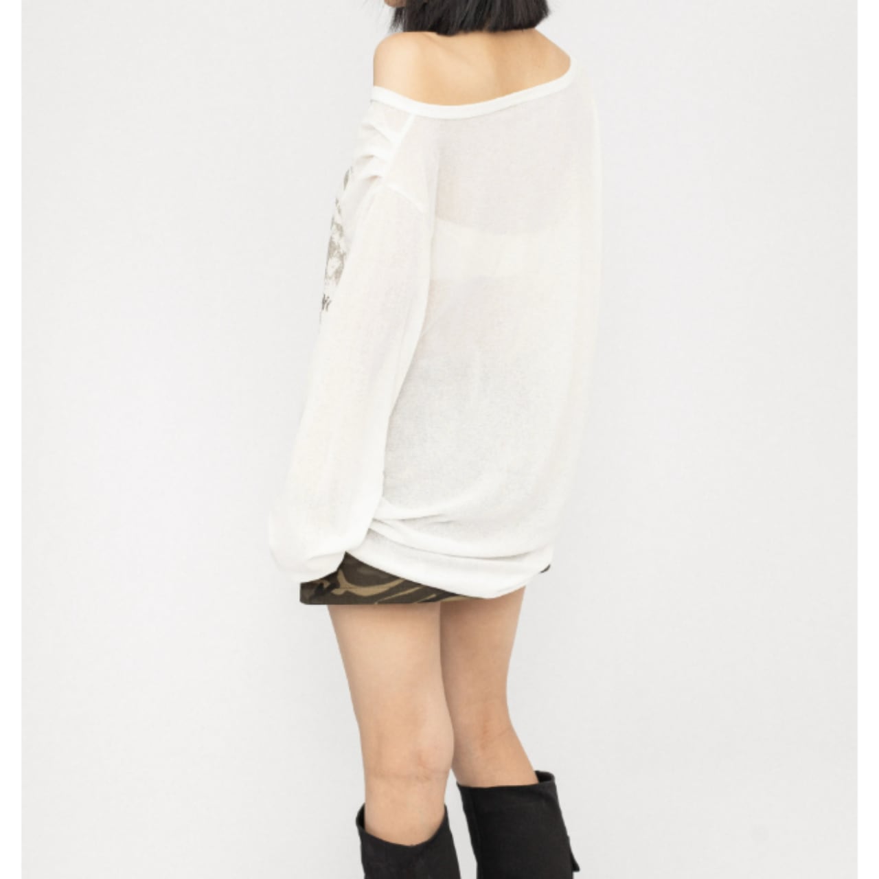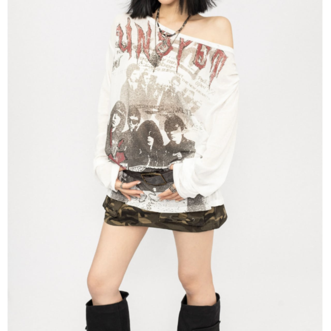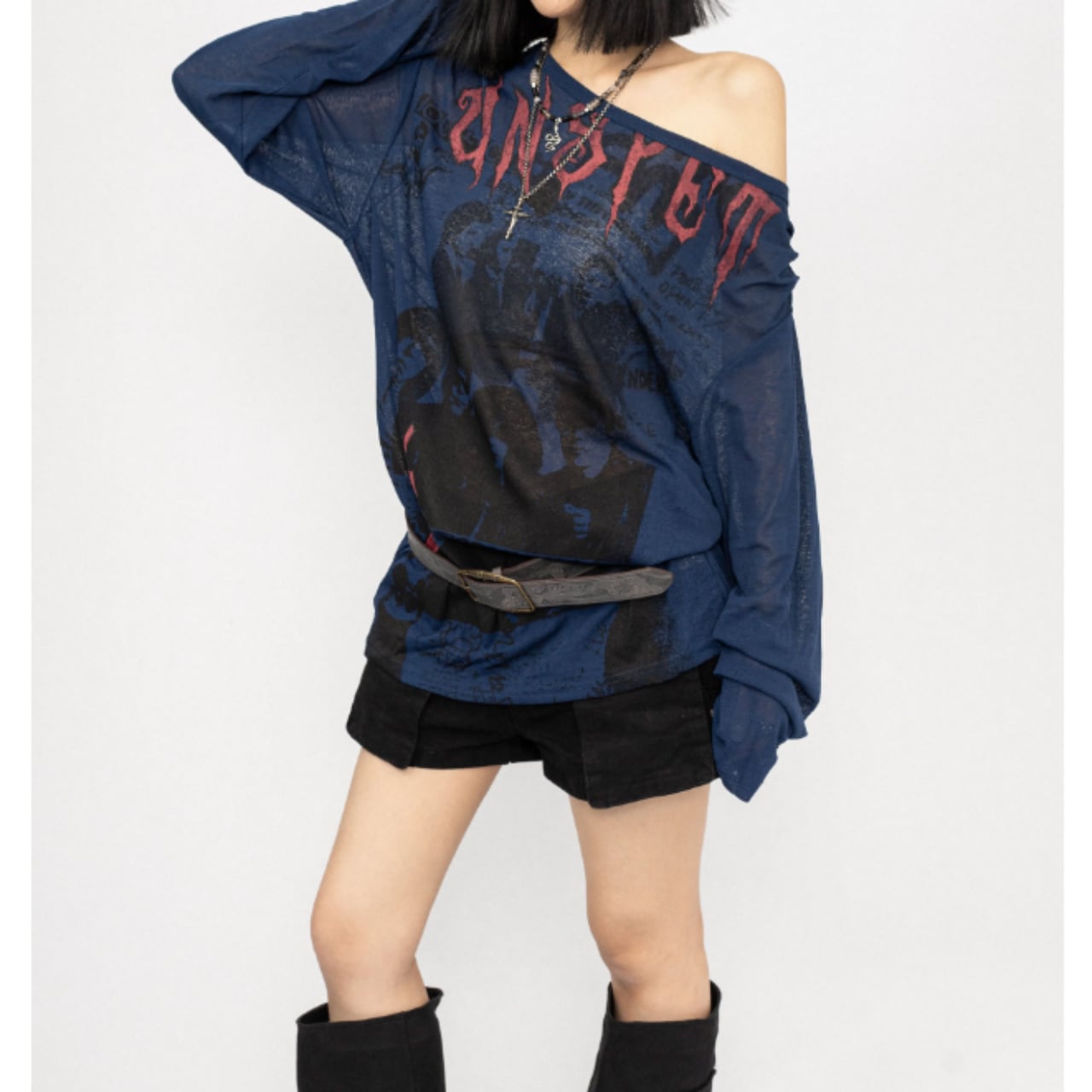 大胆なグラフィックプリントが目を引くオフショルダートップス。