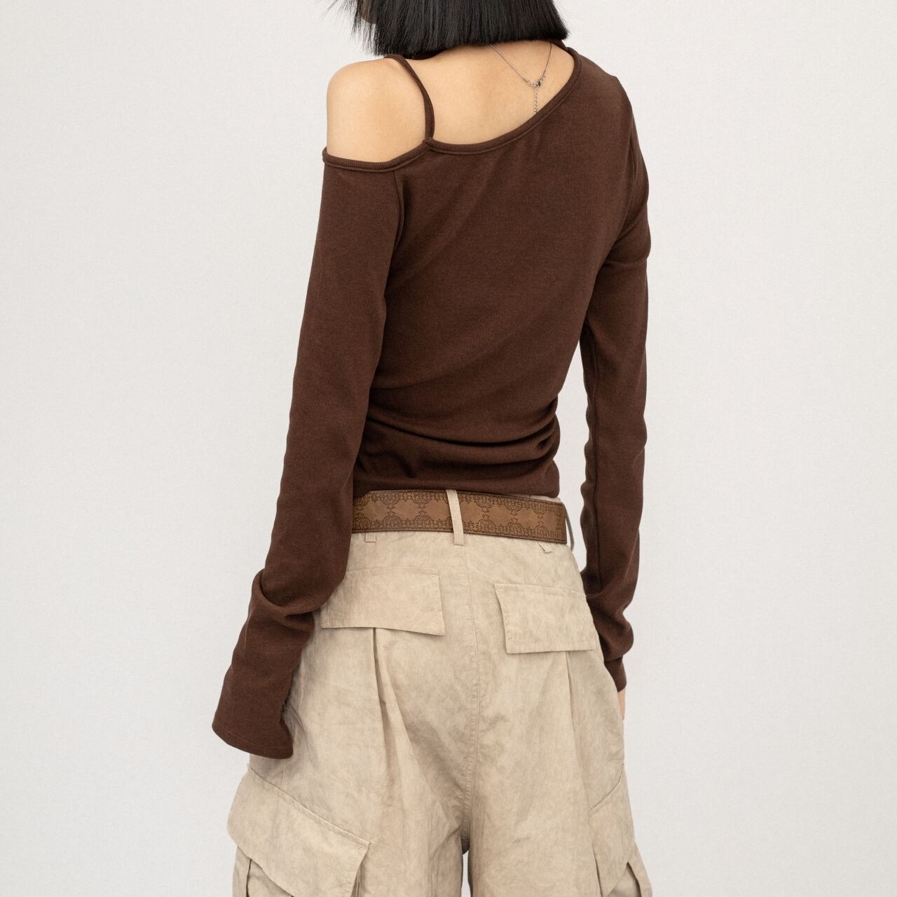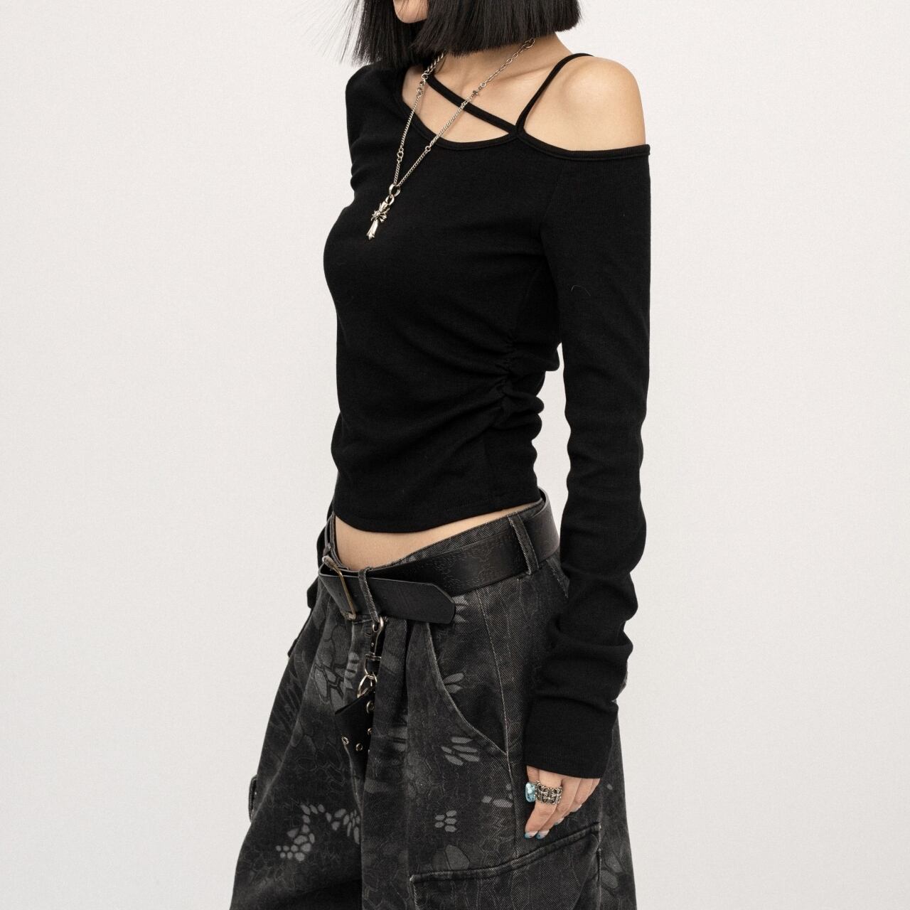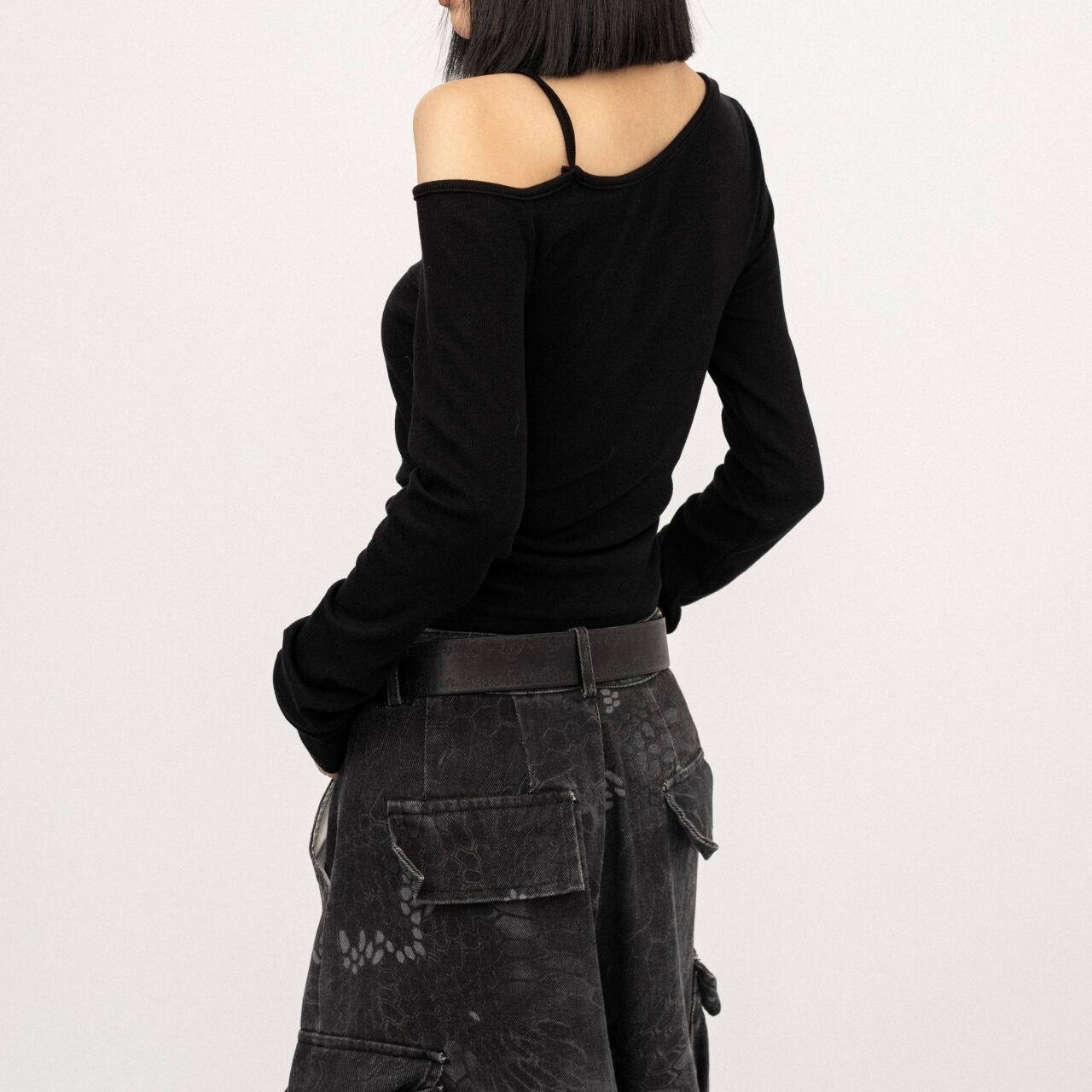 個性的なアシンメトリーデザインのスリムフィットトップス。