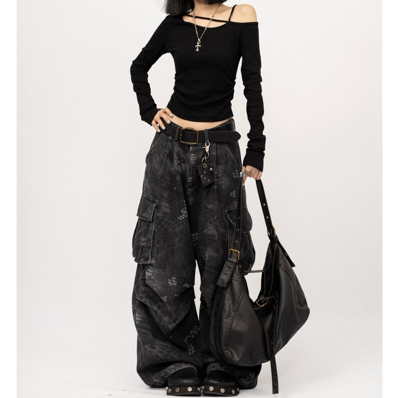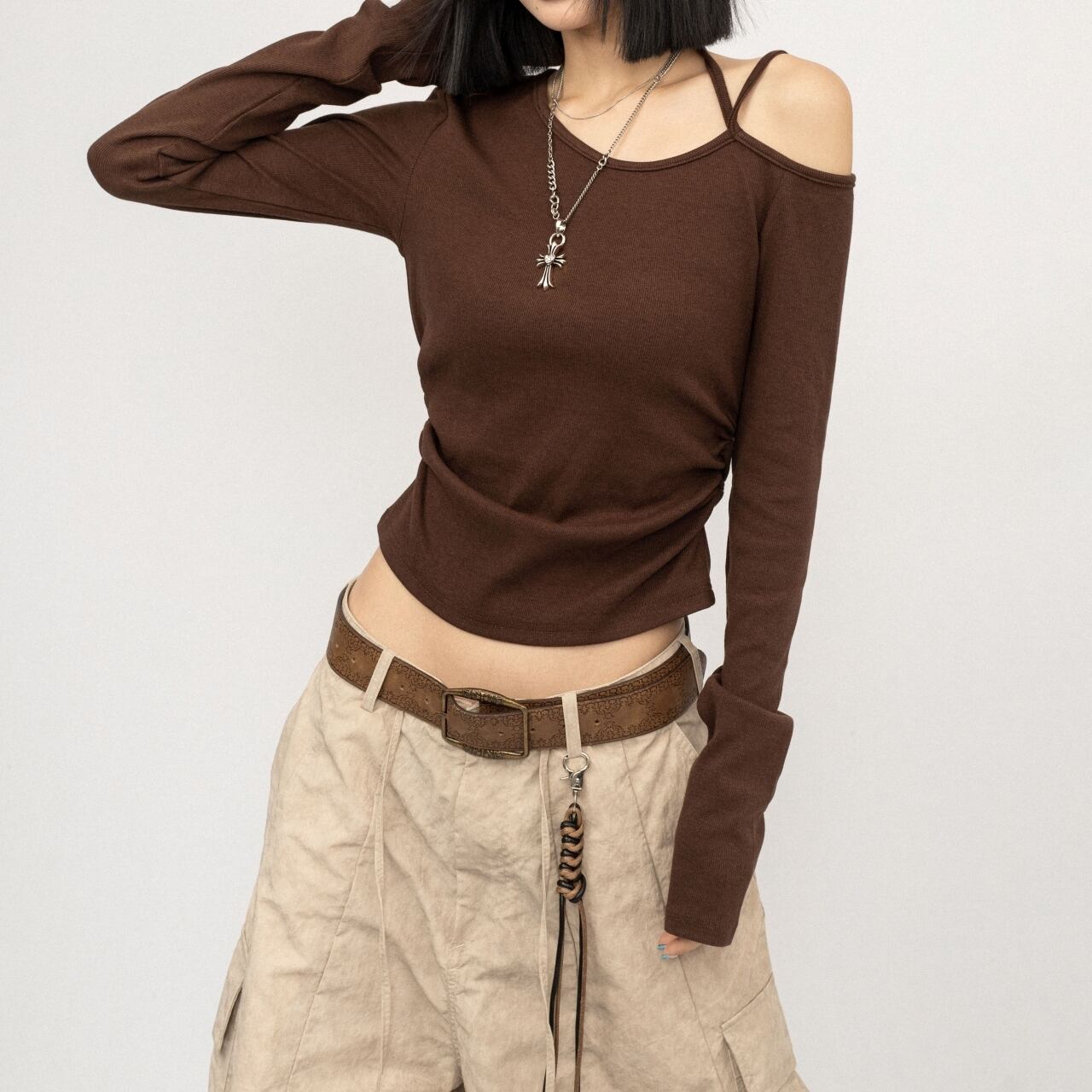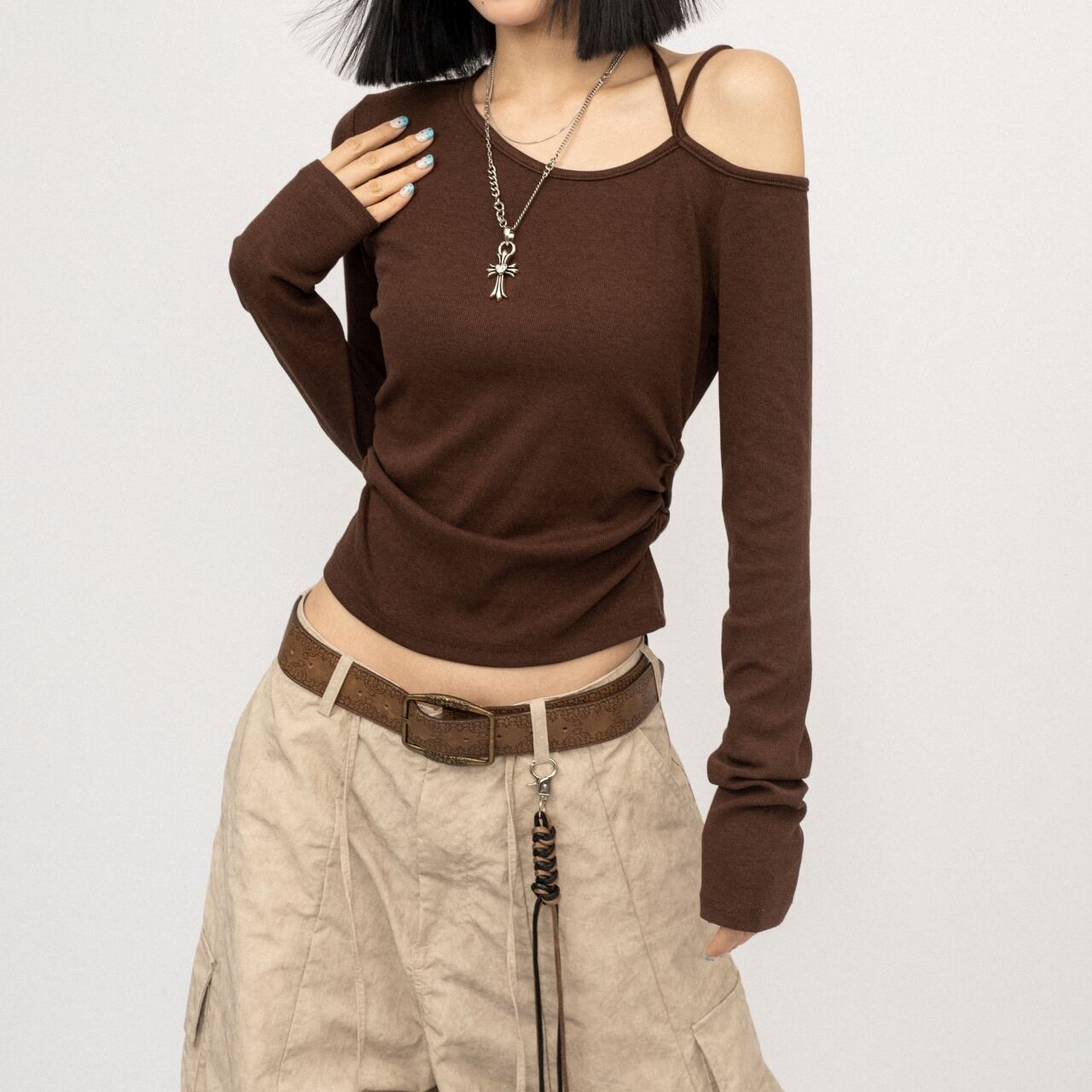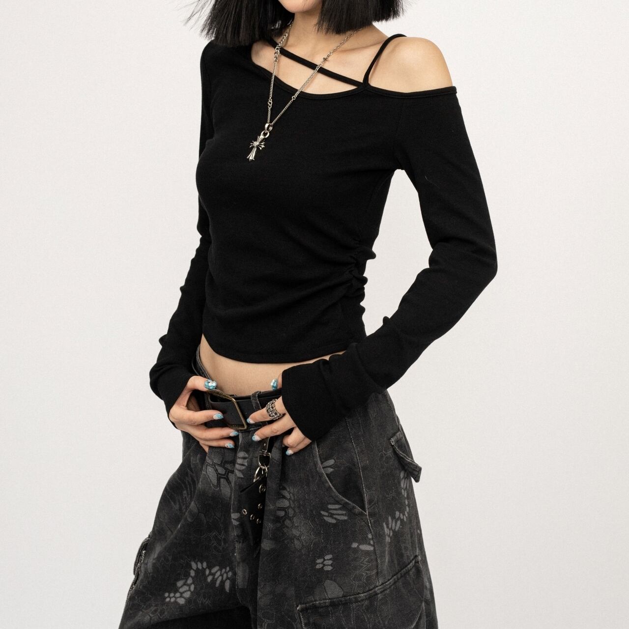 個性的なアシンメトリーデザインのスリムフィットトップス。